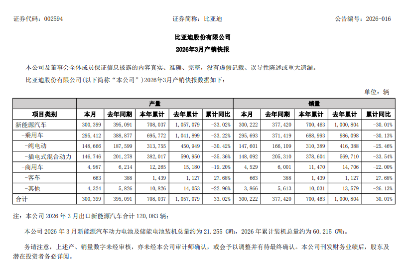 根据公告显示,2026年3月,比亚迪新能源汽车产量为300,399辆,去年同期为395,091辆;销量为300,222辆,去年同期为377,420辆。本年累计产量为708,037辆,去年累计产量为1,057,079辆,累计同比下降33.02%;本年累计销量为700,463辆,去年累计销量为1,000,804辆,累计同比下降30.01%。其中,乘用车产量为295,412辆,销量为295,693辆;纯电动车型产量为148,666辆,销量为147,601辆;插电式混合动力车型产量为146,746辆,销量为148,092辆。商用车方面,产量为4,987辆,销量为4,529辆;客车产量为663辆,销量为663辆;其他车型产量为4,324辆,销量为3,866辆。