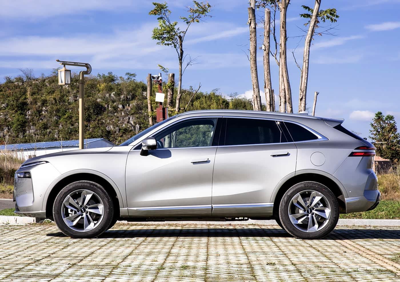 再来看车身侧面部分,新摩卡Hi4 Max版的长宽高分别为4881/1960/1690mm,轴距达到了2915mm,在中型SUV阵营中属于标准的大块头。流畅的车身线条如同雾霭远山,从车头一直延伸至车尾,营造出优雅而动感的姿态。隐藏式电动门把手的加入,不仅提升了车身的整体性,更降低了风阻系数。21寸多辐星脉式全黑轮毂则成为了侧面的视觉焦点,大尺寸轮毂搭配低扁平比轮胎,既增强了车辆的运动感,又为操控性能打下了基础。此外,车身侧面的腰线设计硬朗而不突兀,为整车增添了几分力量感。